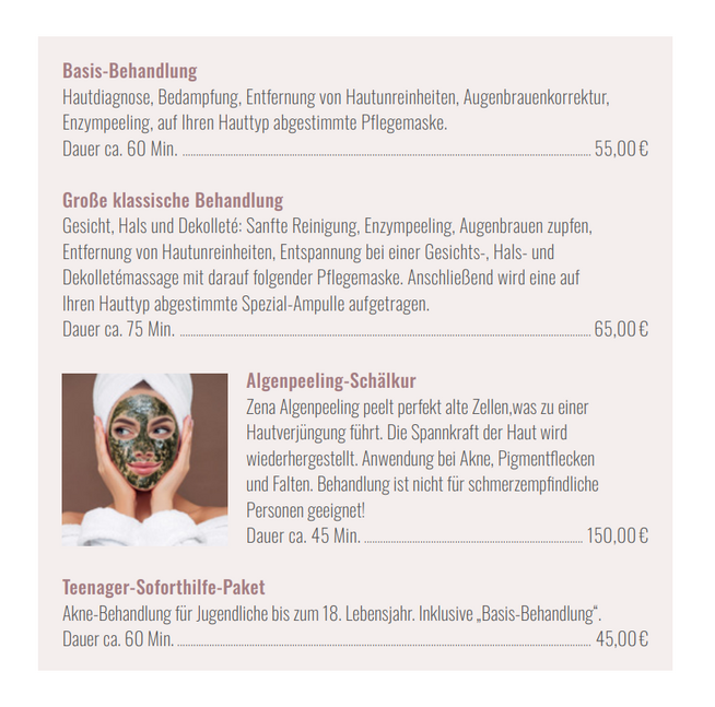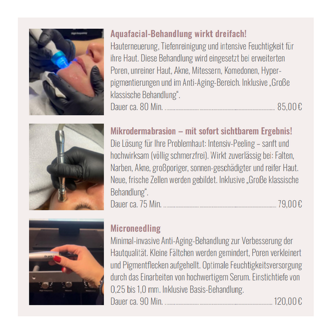 Ob Akne, Narben, Pigmentstörungen, groß - porige Haut oder Falten – Probleme gezielt behandeln und das Hautbild verbessern. Einige Behandlungen können eine effektive Lösung für Dich sein, wie z. B. Aquafacial, Microdermabrasion, Microneedling oder Koreanisches Algenpeeling. Ich berate Dich gern.